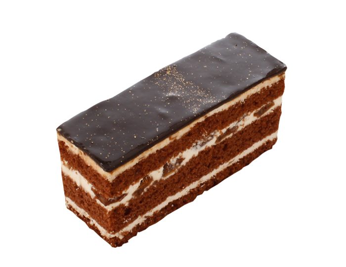ココアスポンジとラムレーズン入りクリームとラム酒漬けのレーズンをたっぷりとサンド、上面にグラサージュチョコをナッペしワンポイントに金粉を掛けました。高級感漂う大人向けのテイストに仕上げています。