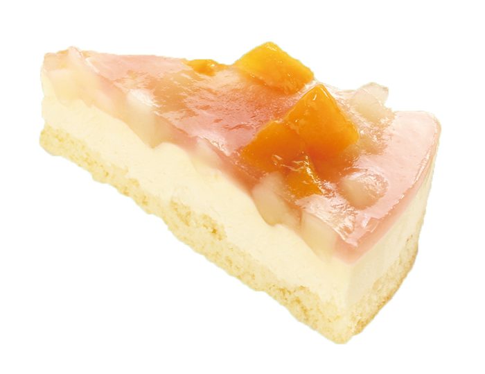 白桃ピューレを使用したピーチ風味のチーズムースを流しフルーティーな白桃と黄桃を飾り、赤桃のナパージュを上掛けした、桃づくしのレアチーズムースです。桃の甘みとチーズの酸味がマッチした一品です。