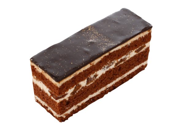 ココアスポンジとラムレーズン入りクリームとラム酒漬けのレーズンをたっぷりとサンド、上面にグラサージュチョコをナッペしワンポイントに金粉を掛けました。高級感漂う大人向けのテイストに仕上げています。