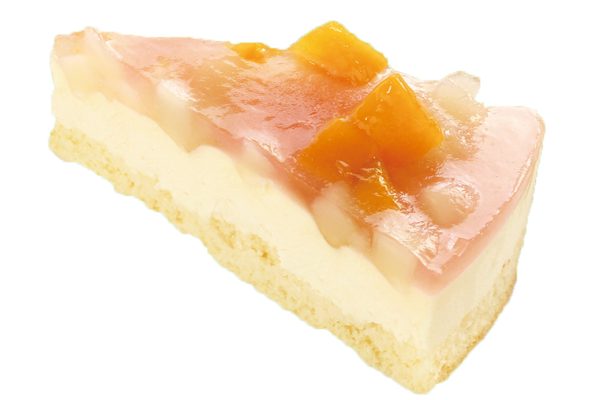 白桃ピューレを使用したピーチ風味のチーズムースを流しフルーティーな白桃と黄桃を飾り、赤桃のナパージュを上掛けした、桃づくしのレアチーズムースです。桃の甘みとチーズの酸味がマッチした一品です。